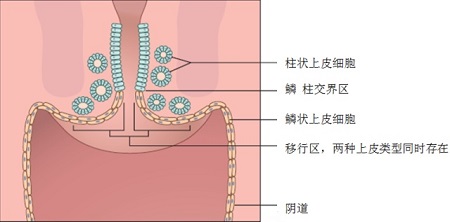 在宫颈的部位上,有两种不同类型的细胞,如上图所示,靠近阴道内的是鳞状上皮细胞,而 靠近子宫那个方向的是柱状上皮细胞。